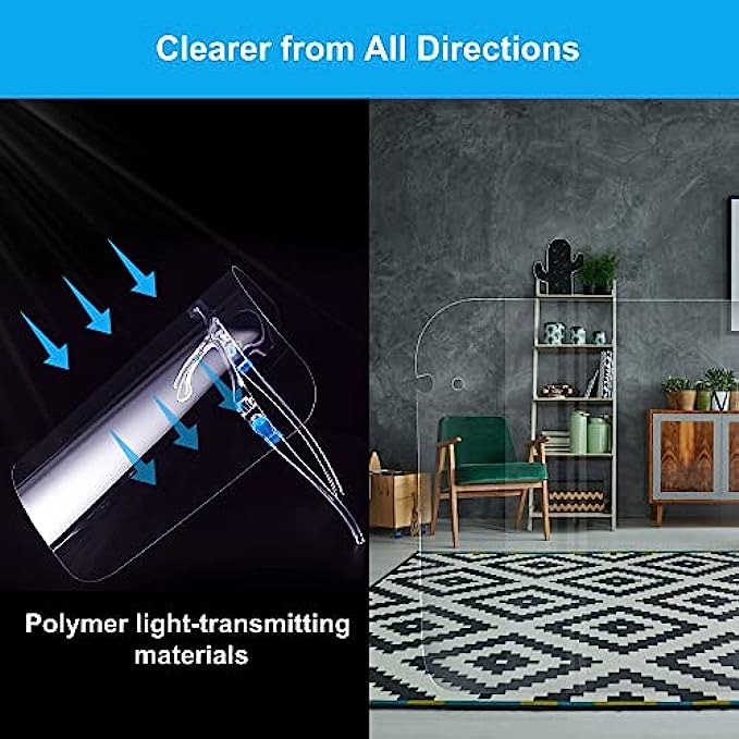 • 【Ultra Clear and Anti-fog Visor】This Face shields with Glasses frames could provide super clear visibility and will not collect water vapor and be cloudy when breathing. Special Anti-fog coating is put on both side of the shield for use in different ascensions. The shield is super clear, after peeling off LAYERS OF PROTECTIVE FILMS ON BOTH SIDE OF THE SHIELD. Environmentally Reusable after disinfecting. Some assembly required.