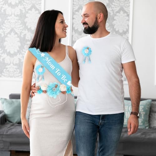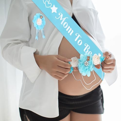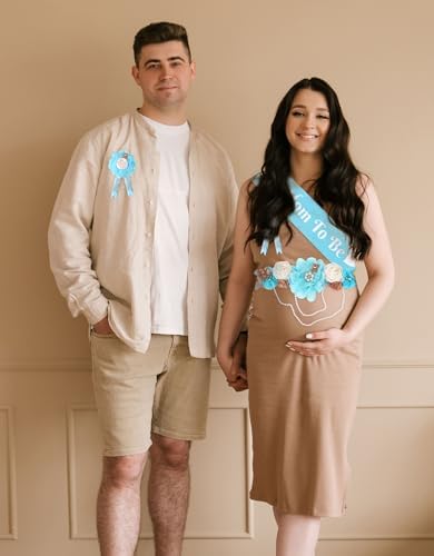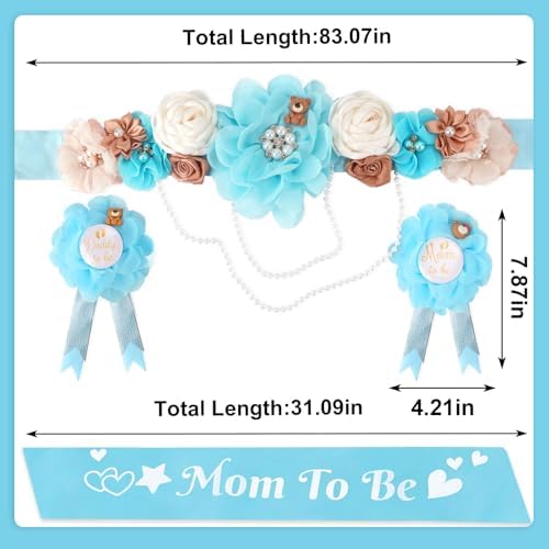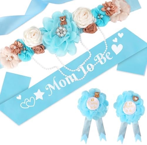 Blue Bear Maternity Sash Corsage Set – 4PCS Floral Belly Belt Baby Shower Decorations with Mom to Be Dad to Be Pins and Pearl Chain for Pregnancy Announcement and Gender Reveal Party