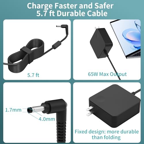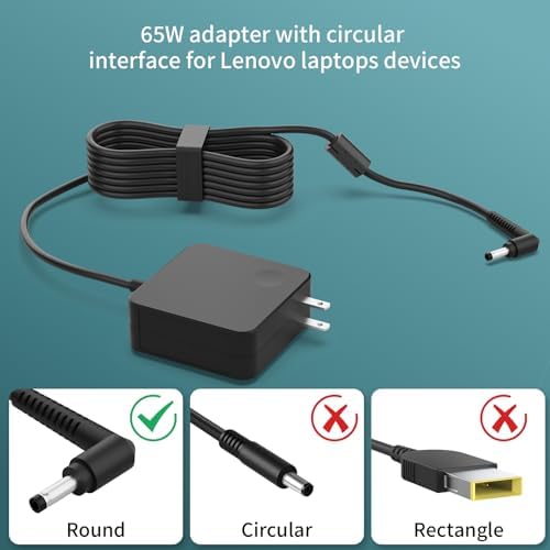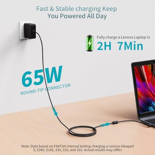 Charger for Lenovo Laptop 65W/45W, Round Tip AC Adapter for IdeaPad 1/3/5, Slim 3/5/7, Flex/Pro Series, S/C Series, Fast Charging, Overheat Protection, Longer Cable for Office, Travel, and Home Use