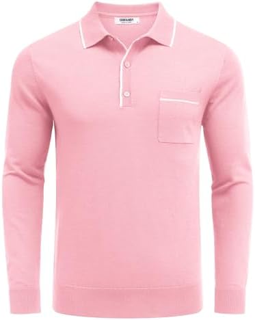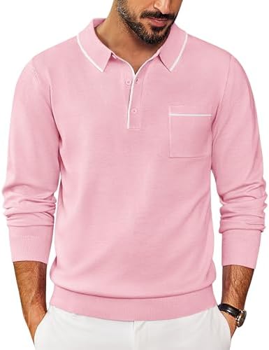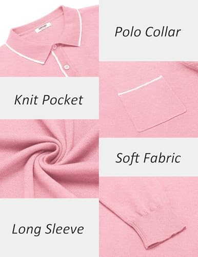 Mens Knit Polo Long Sleeve Collared Sweater Polo Business Casual Polos with Pocket