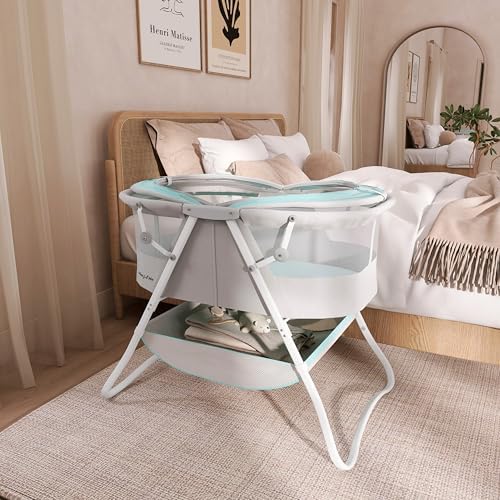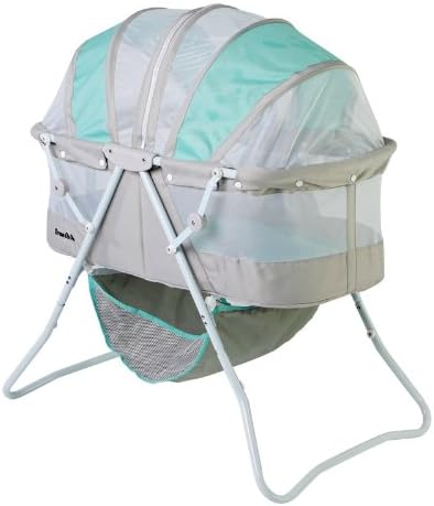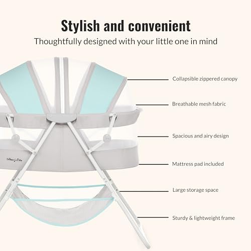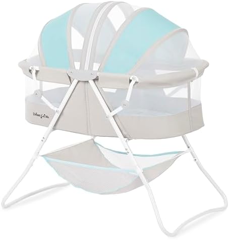 Dream On Me Karley Bassinet in Blue & Grey, Lightweight Portable Baby Bassinet, Quick Fold and Easy to Carry , Adjustable Double Canopy, Indoor and Outdoor Bassinet with Large Storage Basket.
