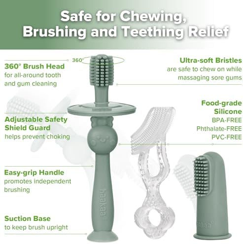 Sponsored Ad - haakaa Training Toothbrush Set Oral Care Kit, Soft Silicone Toothbrush for Baby, Infants, Toddlers & Kids, Pea Green