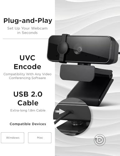 Essential Full HD 1080P Webcam, Dual Microphone, No Driver 1.8m USB 2.0, Wide-Angle, Tilt-Control, 360-Degree Rotation, Black