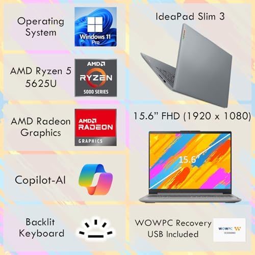 IdeaPad Slim 3 Business Laptop with Backlit Keyboard, 15.6" FHD IPS Display, AMD Ryzen 5 5625U (Outperforms i7-1355U), 16GB RAM, 1TB SSD, SD Card Reader, Windows 11 Pro, WOWPC Recovery USB