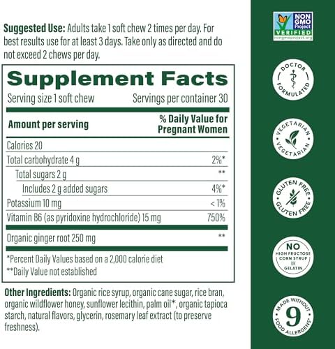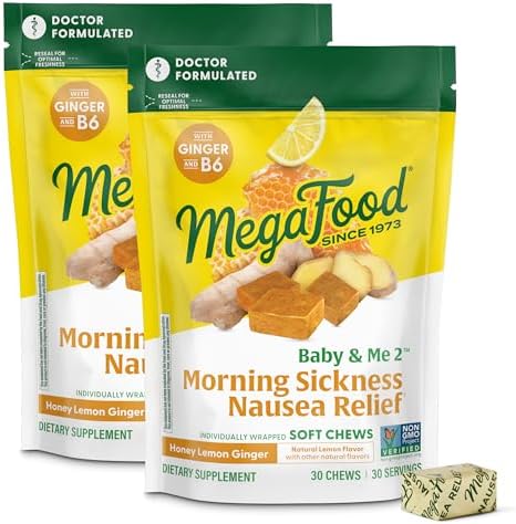 MegaFood Baby & Me Prenatal Morning Sickness Relief, Ginger Chews, with Vitamin B6, Made Without 9 Food Allergens, Honey Lemon Ginger Flavor, 30 Chews (Pack of 2)