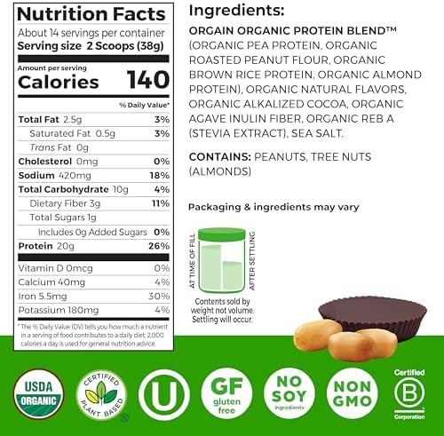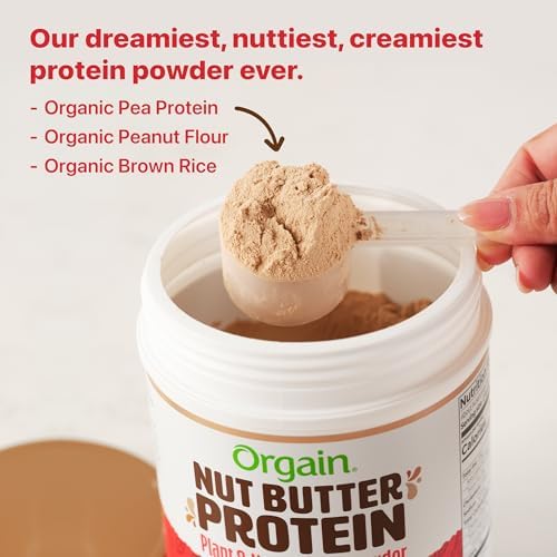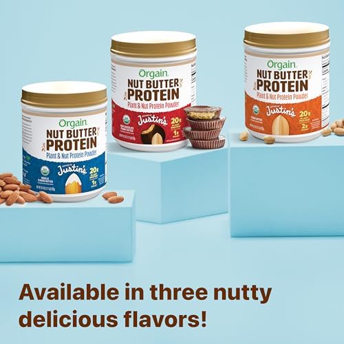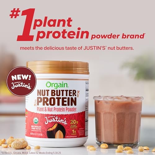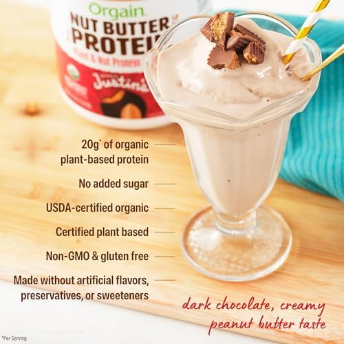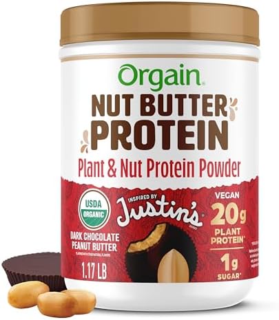 Orgain X Justin's ® Organic Vegan Nut Butter Protein Powder, Chocolate Peanut Butter- 20g Plant Protein, 1g Sugar, Gluten Free, No Dairy, Soy Ingredients, or Artificial Flavors, 1.17 lb