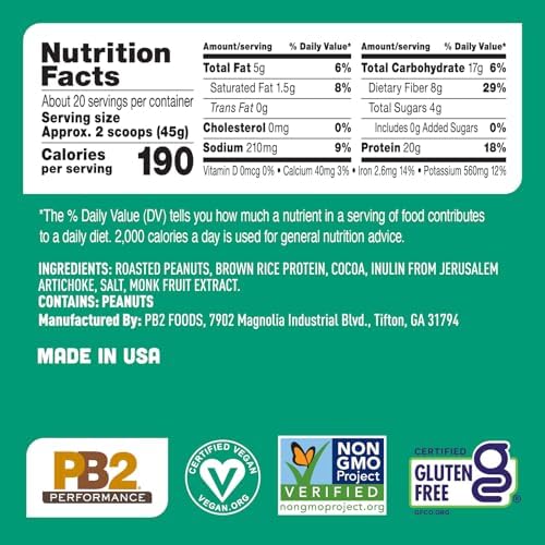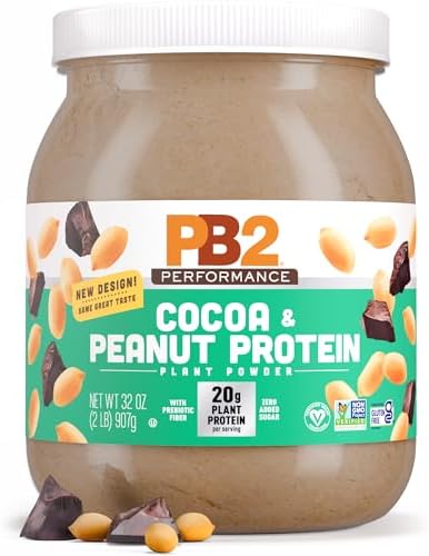 PB2 Performance Peanut Plant Based Vegan Protein Powder | 20g Complete Protein, No Added Sugar, Prebiotic Fiber | Dairy Free, Certified Vegan, Non-GMO, and Gluten Free [Peanut with Dutch Cocoa, 2lb]