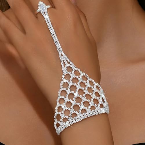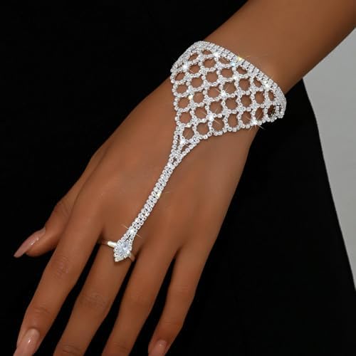 Rhinestone Ring Bracelet for Women Gold Silver Crystal Hand Chain Finger Ring Sparkling Long Tassel Chain Bracelet Prom Rings Bracelet Brides Bridesmaids Wedding Party Dance Banquet Dress Jewelry