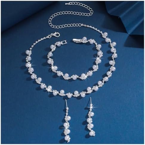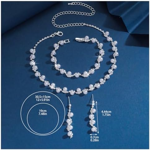 Silver Rhinestone Pearl Necklace Sets for Wedding Brides Bridesmaid Crystal Necklace Earrings Bracelet Set Sexy Pearl Collar Necklace Elegant Pearl Earrings Bracelet Sets for Women Costume Accessories