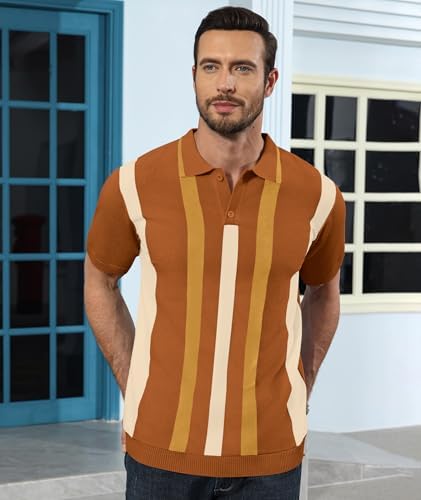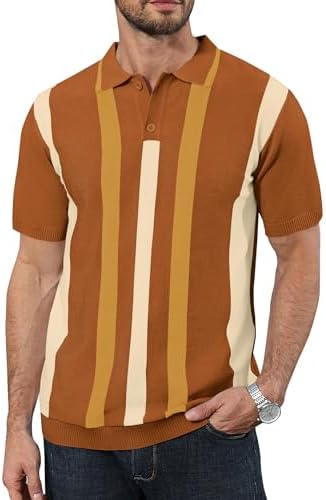 Sponsored Ad - Mens Casual Polo Shirts Knit Short Sleeve Vintage Striped Button T-Shirt Slim Fit Golf Vacation Shirt