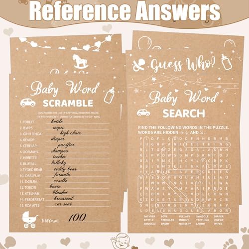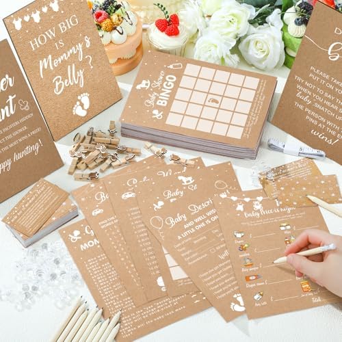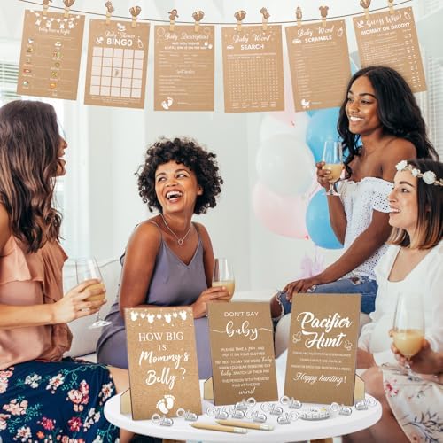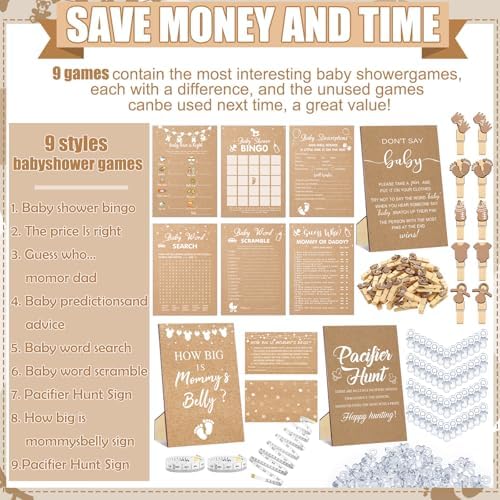 Sherr 476 Pcs Kraft Baby Shower Games 6 Sets Activities Cards Pacifier Hunt Game 50 Pacifiers How Big Is Mommy's Belly Sign 50 Guessing Cards 2 Measuring Tape Don't Say Baby Sign 50 Clothespin