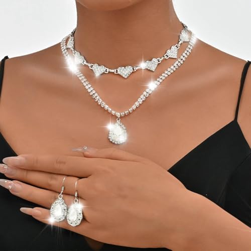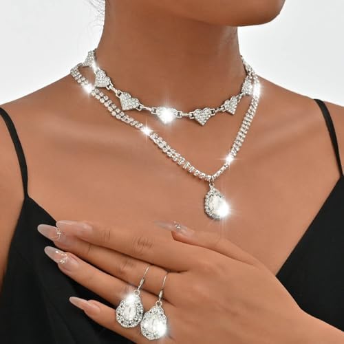 Unicra Silver Bridal Wedding Jewelry Set Sparkly Rhinestone Necklace Earrings Sets Heart Crystal Formal Costume Jewelry for Women and Brides