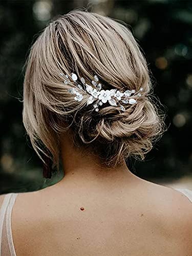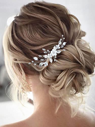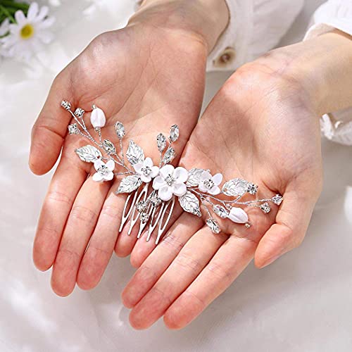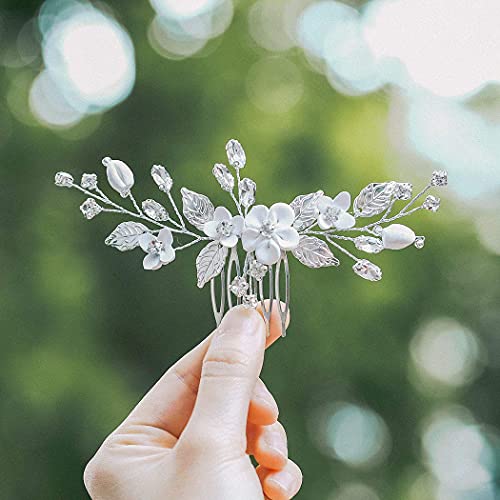 Unicra Bride Silver Wedding Hair Comb Flower Bridal Side Comb Sparkly Crystal Hair Piece Leaf Hair Accessorie for Women and Girls