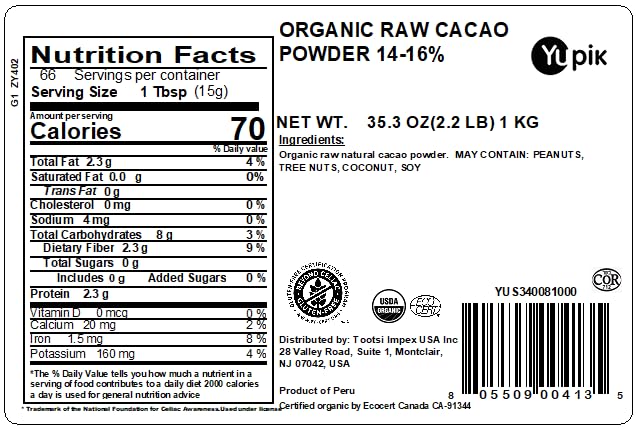 Yupik Organic Raw Cacao Powder, 2.2 lb (35.2 oz), Gluten-Free, GMO-Free, Kosher, Vegan, Dairy-Free, No Added Sugar, Made from Raw Cacao Beans, Rich Chocolate Flavor, Ideal for Baking & Beverages